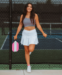 Trendy and fun, our colorful Slay It Sports Tops are double layered in the front for support and coverage. Great under a romper, long sleeve zip front shirt or a Marie Birdie jacket. Mix and match the sports top with solid or matching print bottoms and show girl power on and off the course. Slay it Sports Top is available in color check, RWB flowerchild print, and green garden.